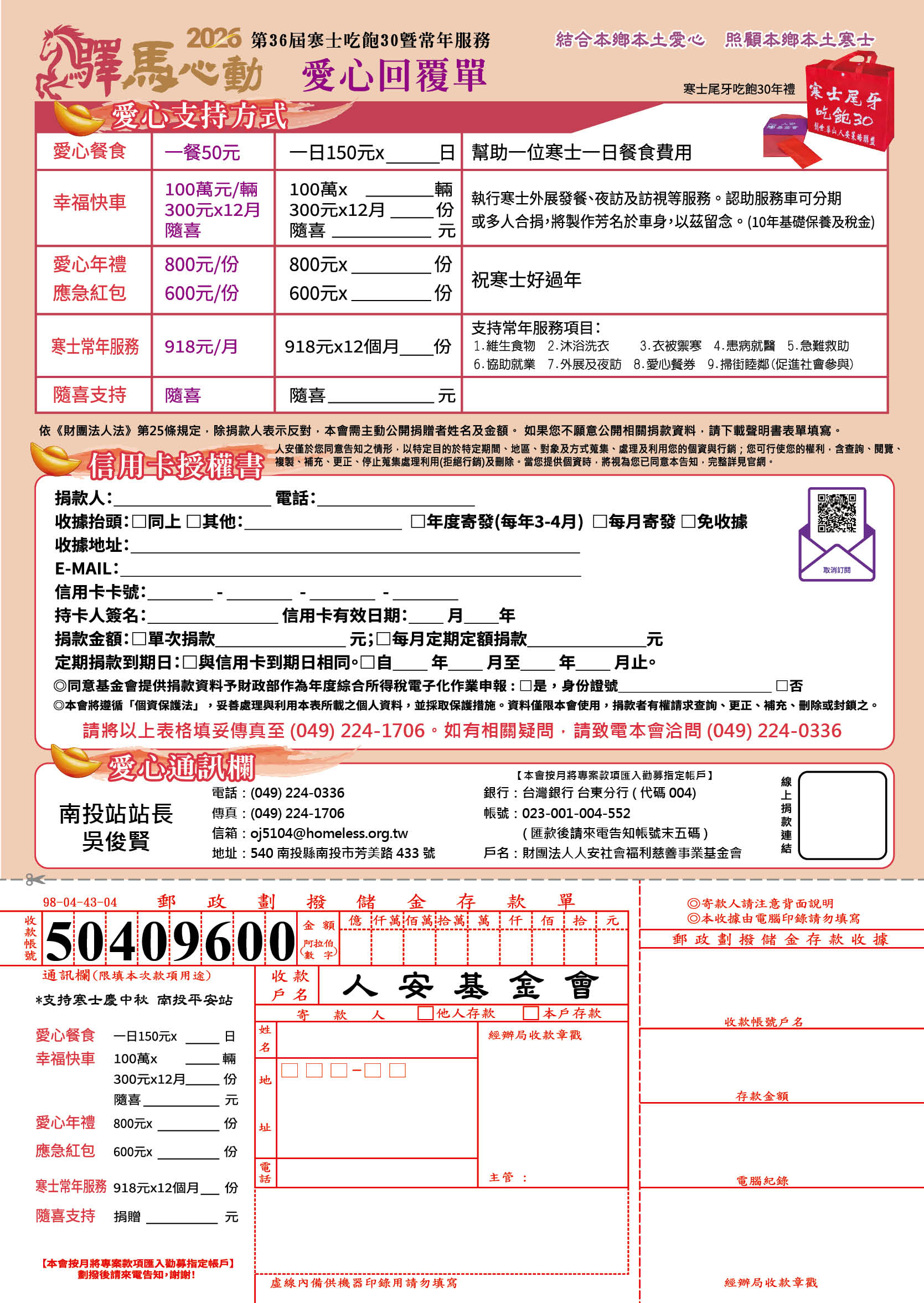 劃撥帳號:5040-9600(請備註“ 尾牙” 以利專款專用)