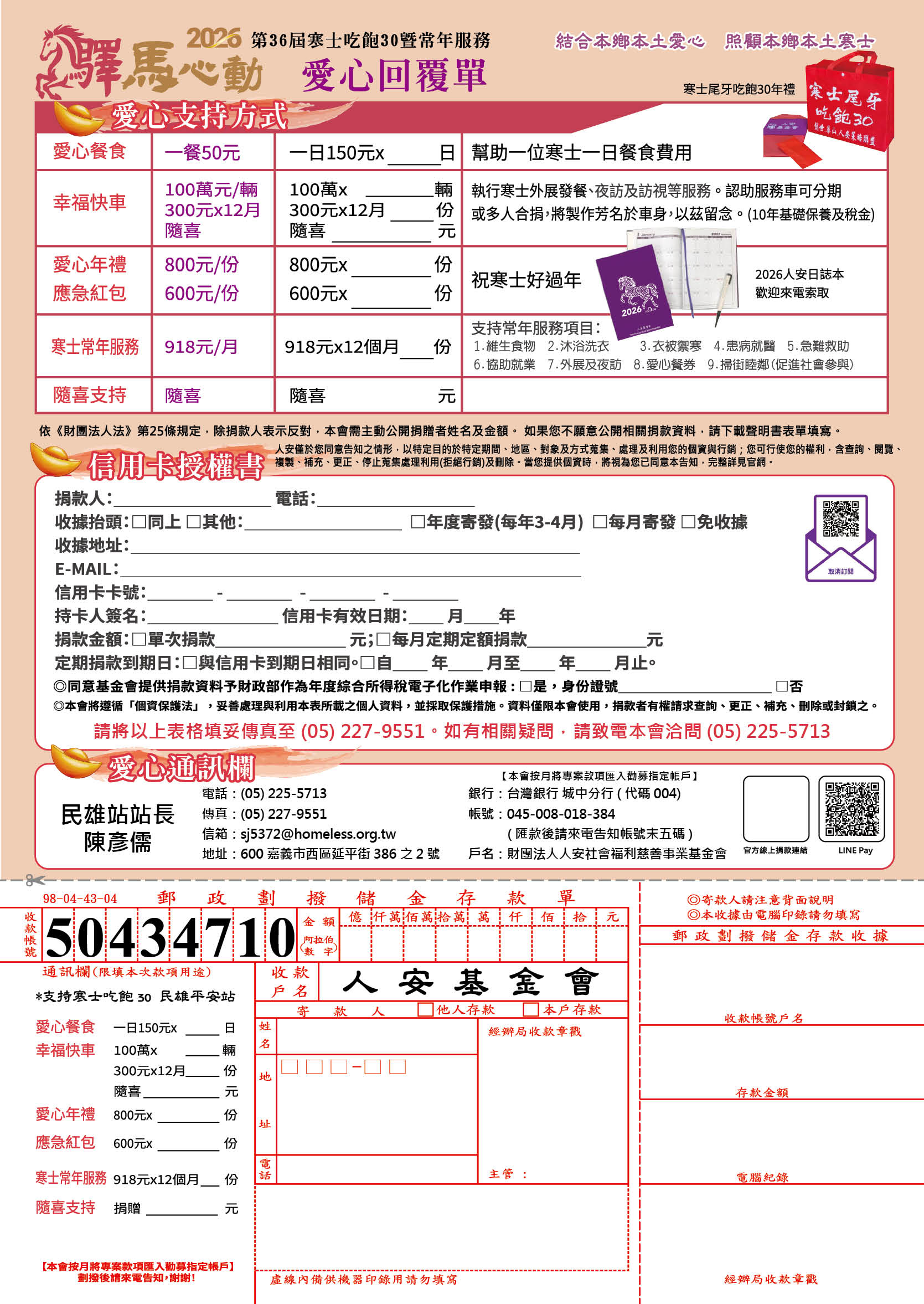 劃撥帳號:5043471-0(請備註“ 尾牙” 以利專款專用)